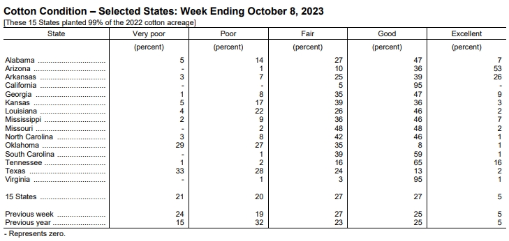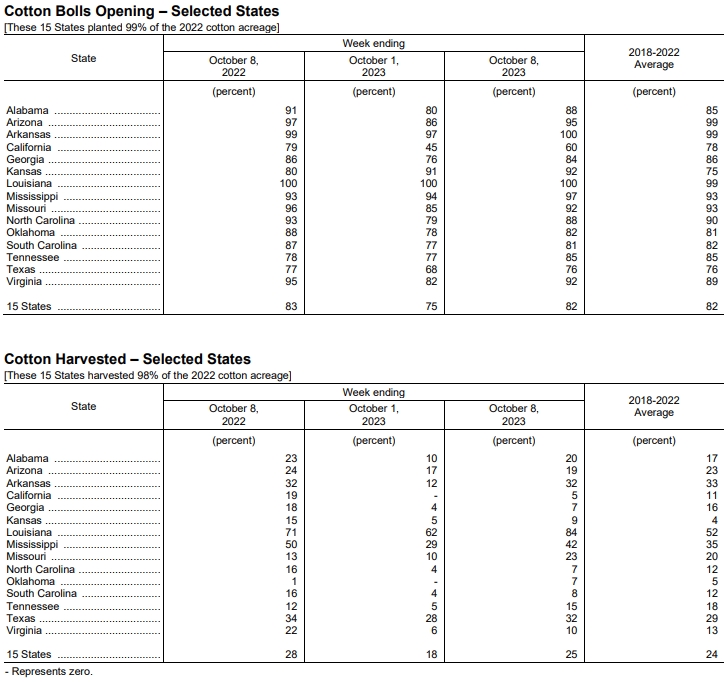 美國農(nóng)業(yè)部10月10日發(fā)布的美國棉花生長報(bào)告顯示,截至10月8日當(dāng)周,美棉盛鈴率為82%,前周為75%,上年同期為83%,五年均值為82%。美棉收割率為25%,前周為18%,去年同期為28%,五年均值為24%。美棉生長優(yōu)良率為32%,前周為30%,去年同期為30%。