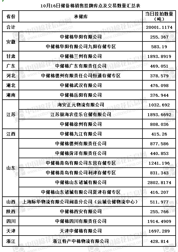 中國儲(chǔ)備棉管理有限公司定于10月16日通過全國棉花交易市場(chǎng)上市銷售儲(chǔ)備棉重量20001.1174噸,共58捆。具體庫點(diǎn)及數(shù)量見下表。