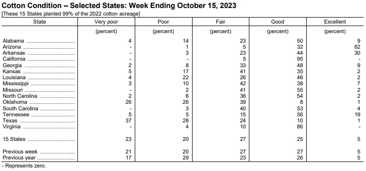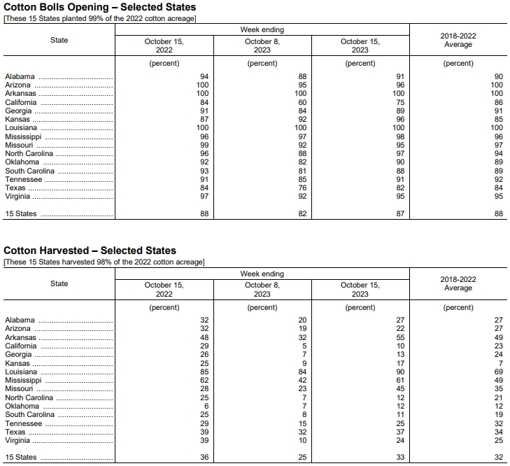 美國農業(yè)部10月16日發(fā)布的美國棉花生長報告顯示,截至10月15日當周,美棉盛鈴率為87%,前周為82%,上年同期為88%,五年均值為88%。美棉收割率為33%,前周為25%,去年同期為36%,五年均值為32%。美棉生長優(yōu)良率為30%,前周為32%,去年同期為31%。