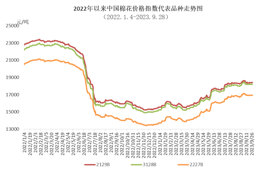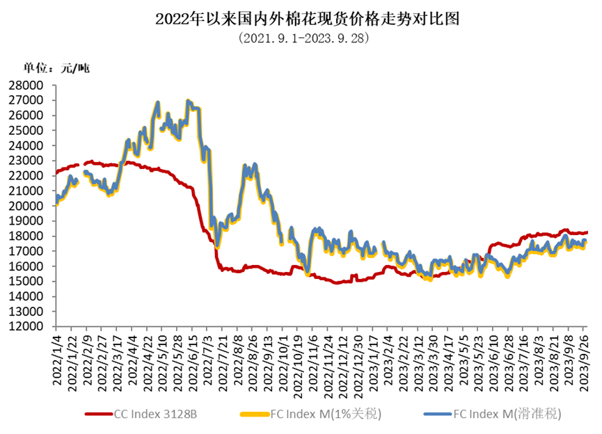 9月,國內(nèi)棉花現(xiàn)貨市場供應(yīng)較充裕,儲備棉競拍成交率依然較高,滑準(zhǔn)稅配額逐漸下發(fā)至紡織廠,國內(nèi)棉價月初上漲至年內(nèi)新高,之后小幅回調(diào)趨于穩(wěn)定。月中下旬因紡織旺季不及預(yù)期,國內(nèi)棉紗成品庫存增加且銷售價格下行,紡織廠對原料采購力度有所轉(zhuǎn)弱,國儲棉及現(xiàn)貨市場成交略有下降。國際市場,受美棉減產(chǎn)和美聯(lián)儲加息預(yù)期增強等因素影響,國際棉價震蕩上漲。