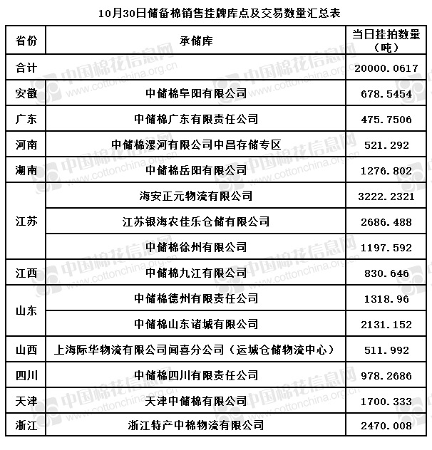 中國儲備棉管理有限公司定于10月30日通過全國棉花交易市場上市銷售儲備棉重量20000.0617噸,共56捆。具體庫點(diǎn)及數(shù)量見下表。