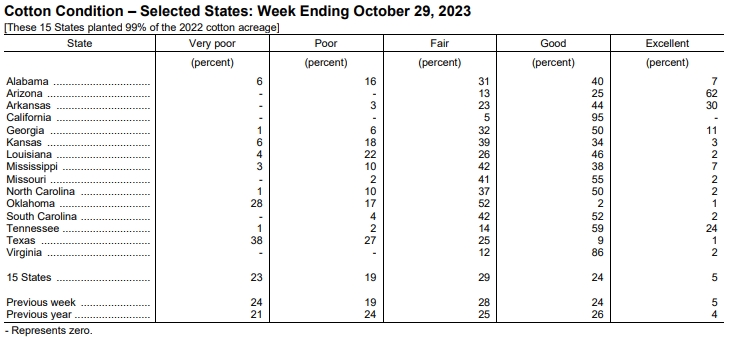 美國農(nóng)業(yè)部10月30日發(fā)布的美國棉花生長報(bào)告顯示,截至10月29日當(dāng)周,美棉盛鈴率為93%,前周為90%,上年同期為95%,五年均值為95%。美棉收割率為49%,前周為41%,去年同期為54%,五年均值為47%。美棉生長優(yōu)良率為29%,前周為29%,去年同期為30%。