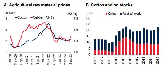 據(jù)外電10月30日消息,世界銀行在其最新《大宗商品市場展望》報告中指出,與上一季度相比,2023年第3季度棉價變化不大,但與去年同期相比下跌23%。