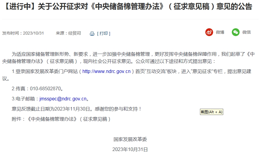 【進(jìn)行中】關(guān)于公開征求對(duì)《中央儲(chǔ)備棉管理辦法》(征求意見稿)意見的公告