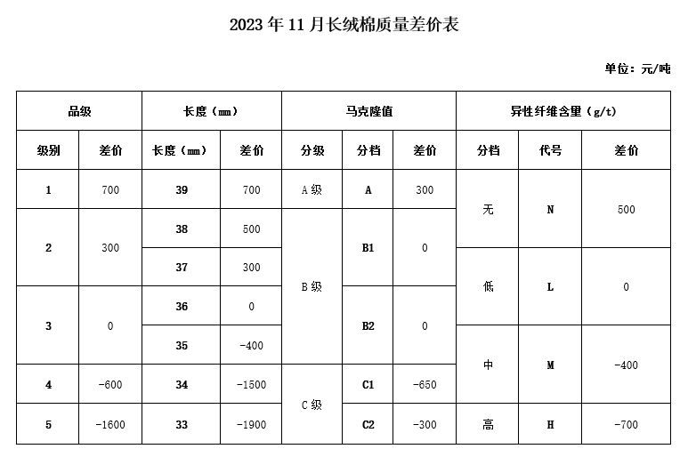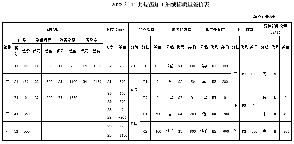 根據(jù)《中國棉花協(xié)會國產(chǎn)棉質(zhì)量差價表管理辦法》規(guī)定,現(xiàn)正式發(fā)布2023年11月《鋸齒加工細(xì)絨棉質(zhì)量差價表》、《皮輥加工細(xì)絨棉質(zhì)量差價表》和《長絨棉質(zhì)量差價表》(單位:元/噸)。