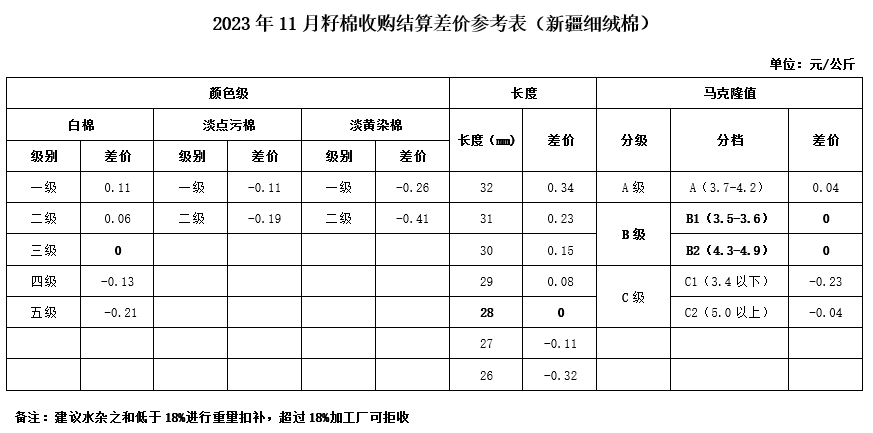 依據(jù)中國棉花協(xié)會(huì)發(fā)布的2023年10月《鋸齒加工細(xì)絨棉質(zhì)量差價(jià)表》和中國棉花預(yù)警系統(tǒng)2023年9-10月新疆籽棉收購平均衣分率數(shù)據(jù),折算得出籽棉收購差價(jià),現(xiàn)正式發(fā)布2023年11月《籽棉收購結(jié)算差價(jià)參考表(新疆細(xì)絨棉)》(單位:元/公斤),為新疆地區(qū)籽棉收購工作提供參考。