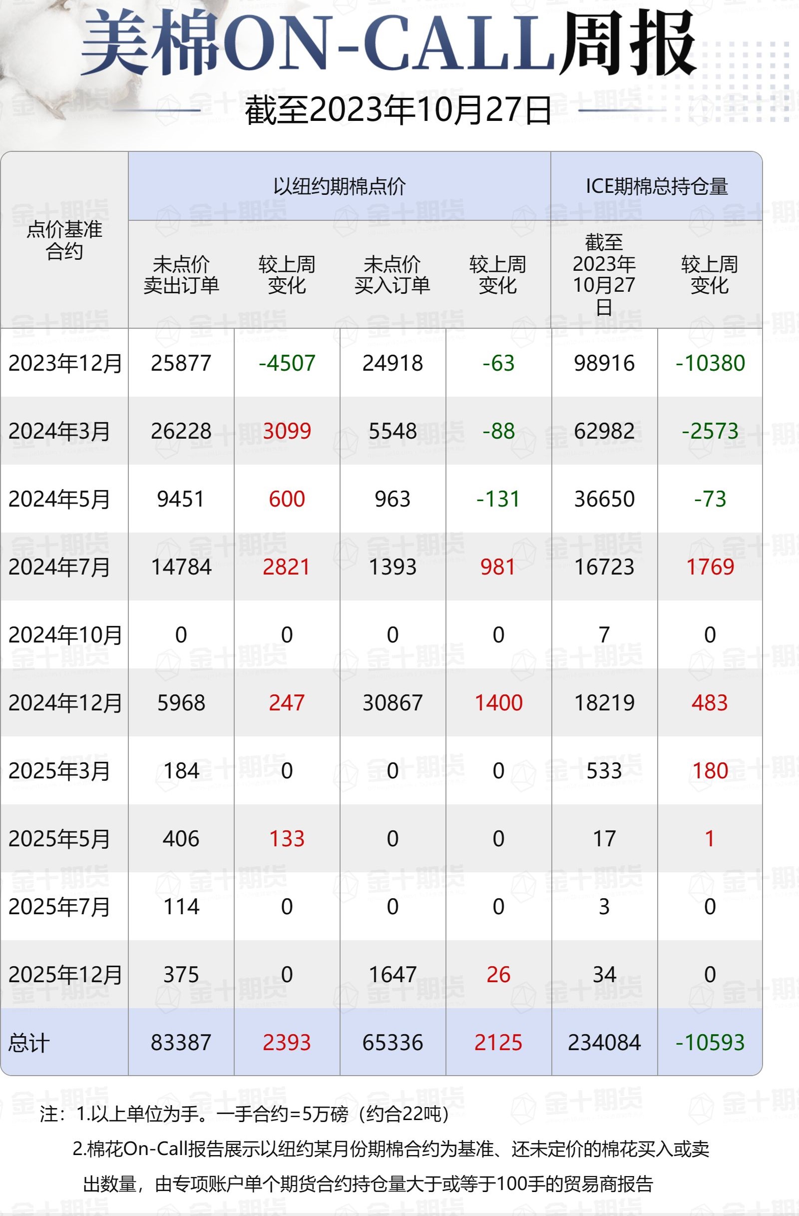 據(jù)美國(guó)商品期貨交易委員會(huì)(CFTC)最新數(shù)據(jù),截至10月27日,①美棉On-Call未點(diǎn)價(jià)賣(mài)出訂單83387手,環(huán)比增加2393手;未點(diǎn)價(jià)買(mǎi)入訂單65336手,環(huán)比增加2125手;②ICE期棉2312合約上賣(mài)方未點(diǎn)價(jià)合約為25877手,較此前一周減少4507手;③ICE期棉2403合約上賣(mài)方未點(diǎn)價(jià)合約為26228手,較此前一周增加3099手;④ICE期棉2405合約上賣(mài)方未點(diǎn)價(jià)合約為9451手,較此前一周增加600手;⑤ICE期棉2407合約上賣(mài)方未點(diǎn)價(jià)合約為14784手,較此前一周增加2821手;⑥ICE棉花期貨盤(pán)面2023/24年度(8月至次年7月)的On-Call合約未點(diǎn)價(jià)賣(mài)出訂單為76340手,環(huán)比增加2013手。