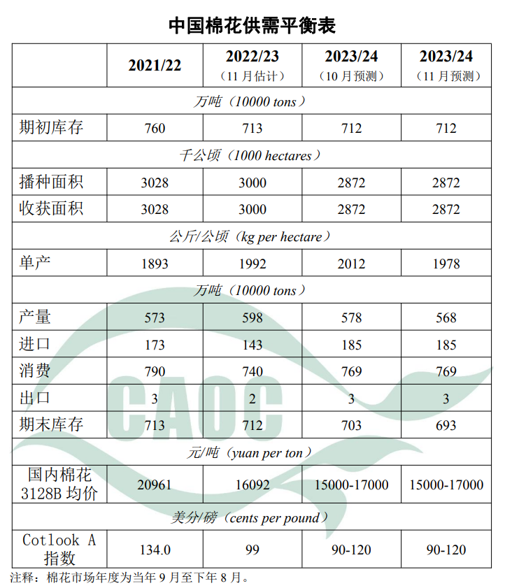 2023/24年度棉花采摘進(jìn)入收尾階段。據(jù)國家棉花市場監(jiān)測系統(tǒng)數(shù)據(jù),截至11月2日,全國新棉采摘進(jìn)度76.8%,同比下降8.6個百分點(diǎn),其中新疆采摘進(jìn)度76.6%,同比下降9.0個百分點(diǎn)。本年度全國棉區(qū)綜合氣候適宜指數(shù)為較適宜,低于去年同期水平,新疆部分產(chǎn)區(qū)播種期和生長期不利天氣影響單產(chǎn)。本月預(yù)測,2023/24年度產(chǎn)量調(diào)減10萬噸至568萬噸,棉花進(jìn)出口、消費(fèi)維持上月不變。