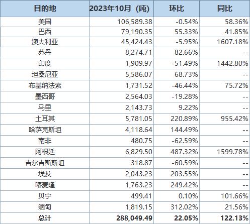 據(jù)海關(guān)統(tǒng)計(jì)數(shù)據(jù),2023年10月我國(guó)進(jìn)口棉花約29萬(wàn)噸,環(huán)比增加約5萬(wàn)噸,同比增長(zhǎng)約122.1%。