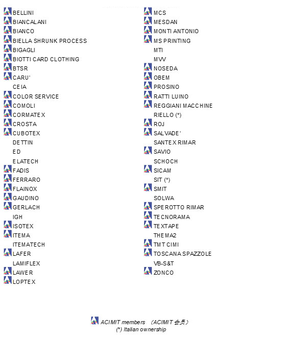意大利紡織機械制造商協(xié)會(ACIMIT)成立于1945年,其主要目標(biāo)是為意大利紡織機械行業(yè)在國內(nèi)外的活動提供大力支持,推動意大利紡織機械行業(yè)發(fā)展。作為一個非營利組織,ACIMIT目前匯集了大約180家紡織機械制造商,產(chǎn)品類別主要涉及:紡織、編織、針織、整理、和其他機械。ACIMIT所代表的產(chǎn)業(yè)部門由大約300家企業(yè)(大約13,000名雇員)組成,這些制造商生產(chǎn)的機械總價值約為27億歐元,其中86%產(chǎn)品出口。依托卓越的創(chuàng)意、可持續(xù)技術(shù)、可靠性和質(zhì)量,意大利紡織機械在全球處于領(lǐng)先地位。