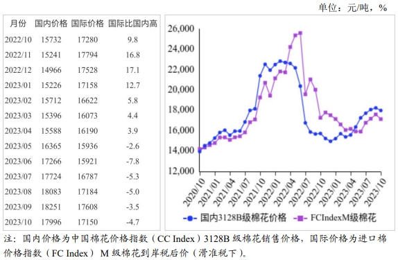 (一)國內(nèi)棉價止?jié)q轉(zhuǎn)跌。本月,新疆棉花大規(guī)模采收,加之儲備棉持續(xù)銷售,進(jìn)口棉不斷到港,棉花供給階段性充裕;下游紡織市場復(fù)蘇程度有限,紡企新增訂單量不足,需求相對疲軟。新棉銷售壓力增大,棉價小幅下跌,銷售進(jìn)度較往年偏慢。據(jù)國家棉花市場監(jiān)測系統(tǒng)數(shù)據(jù),截至10月26日,全國新棉采摘進(jìn)度67.5%,同比下降6.0個百分點(diǎn);全國交售率55.2%,同比下降2.7個百分點(diǎn)。據(jù)《中國棉花工業(yè)庫存調(diào)查報(bào)告》數(shù)據(jù),10月初全國棉花工業(yè)庫存63.5萬噸,環(huán)比增6.4%,同比增12%。采購意向調(diào)查顯示,10月初準(zhǔn)備采購棉花的企業(yè)占56.1%,環(huán)比增1.5個百分點(diǎn),同比減3.0個百分點(diǎn),比近5年同期平均水平減少0.8個百分點(diǎn)。10月國內(nèi)3128B級棉花月均價每噸17996元,環(huán)比跌1.4%,同比漲14.4%。鄭棉期貨主力合約(CF401)月結(jié)算價每噸16095元,環(huán)比跌6.3%,同比漲19.7%。