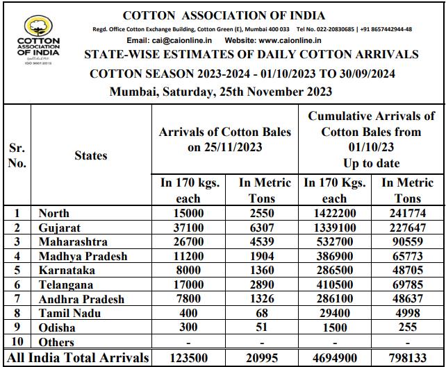 據(jù)外電11月25日消息,印度棉花協(xié)會(huì)(CAI)公布,11月25日印度棉花到貨量預(yù)計(jì)為123500包(每包170公斤)或20995噸。