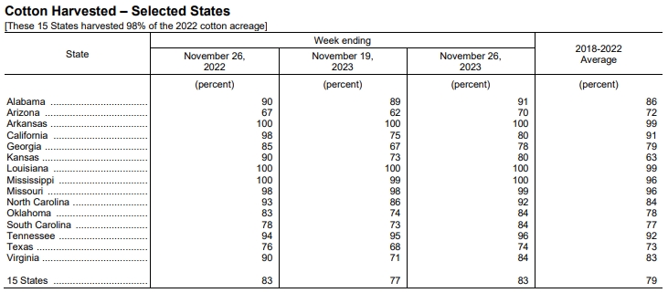 美國農(nóng)業(yè)部11月27日發(fā)布的美國棉花生長報告顯示,截至11月26日當(dāng)周,美棉收割率為83%,前周為77%,去年同期為83%,五年均值為79%。