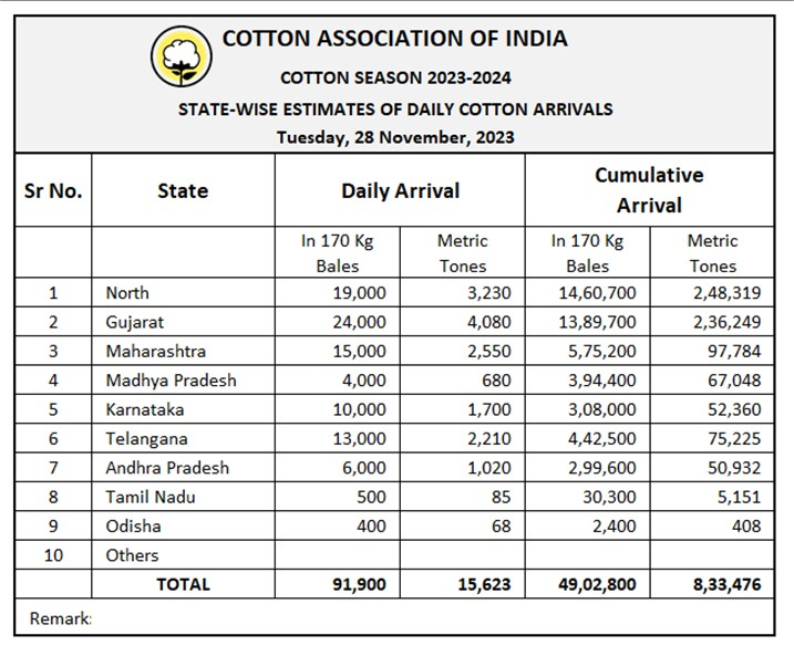 2023/24年度(10月至次年9月)迄今,印度棉花到貨量為4902800包。
