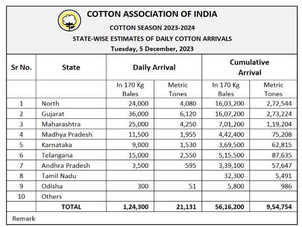 據(jù)外電12月5日消息,印度棉花協(xié)會(CAI)公布,12月5日印度棉花到貨量預計為124300包(每包170公斤)或21131噸。