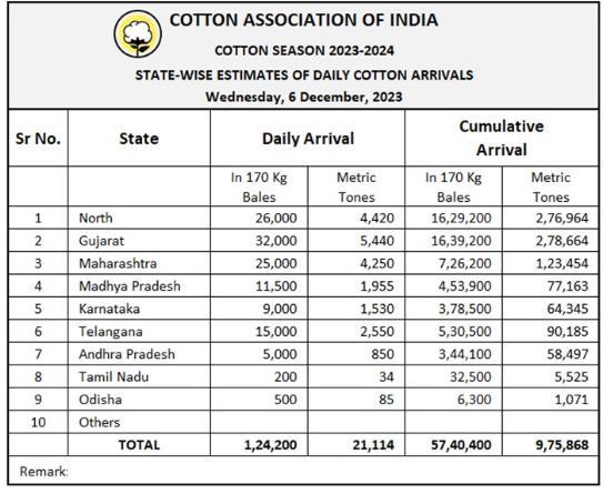 據(jù)外電12月6日消息,印度棉花協(xié)會(huì)(CAI)公布,12月6日印度棉花到貨量預(yù)計(jì)為124200包(每包170公斤)或21114噸。