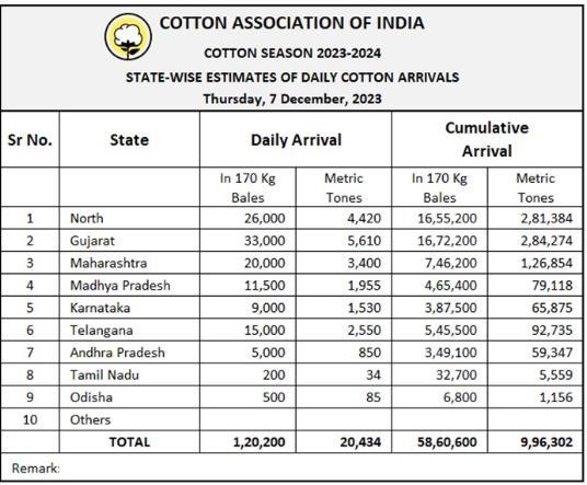 據(jù)外電12月7日消息,印度棉花協(xié)會(huì)(CAI)公布,12月7日印度棉花到貨量預(yù)計(jì)為120200包(每包170公斤)或20434噸。