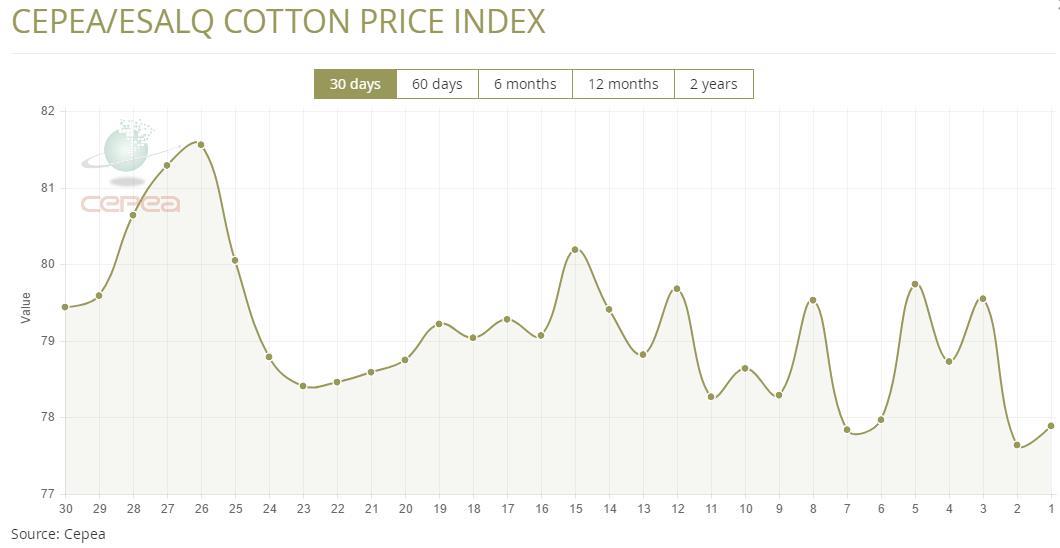 據(jù)外電12月12日消息,12月12日巴西CEPEA/ESALQ棉花價(jià)格指數(shù)報(bào)每磅77.89美分,較前一日上漲0.32%。