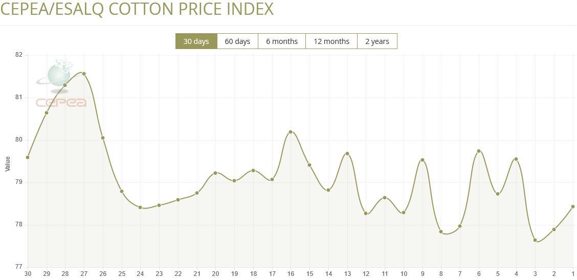 據(jù)外電12月13日消息,12月13日巴西CEPEA/ESALQ棉花價格指數(shù)報每磅78.43美分,較前一日上漲0.69%。