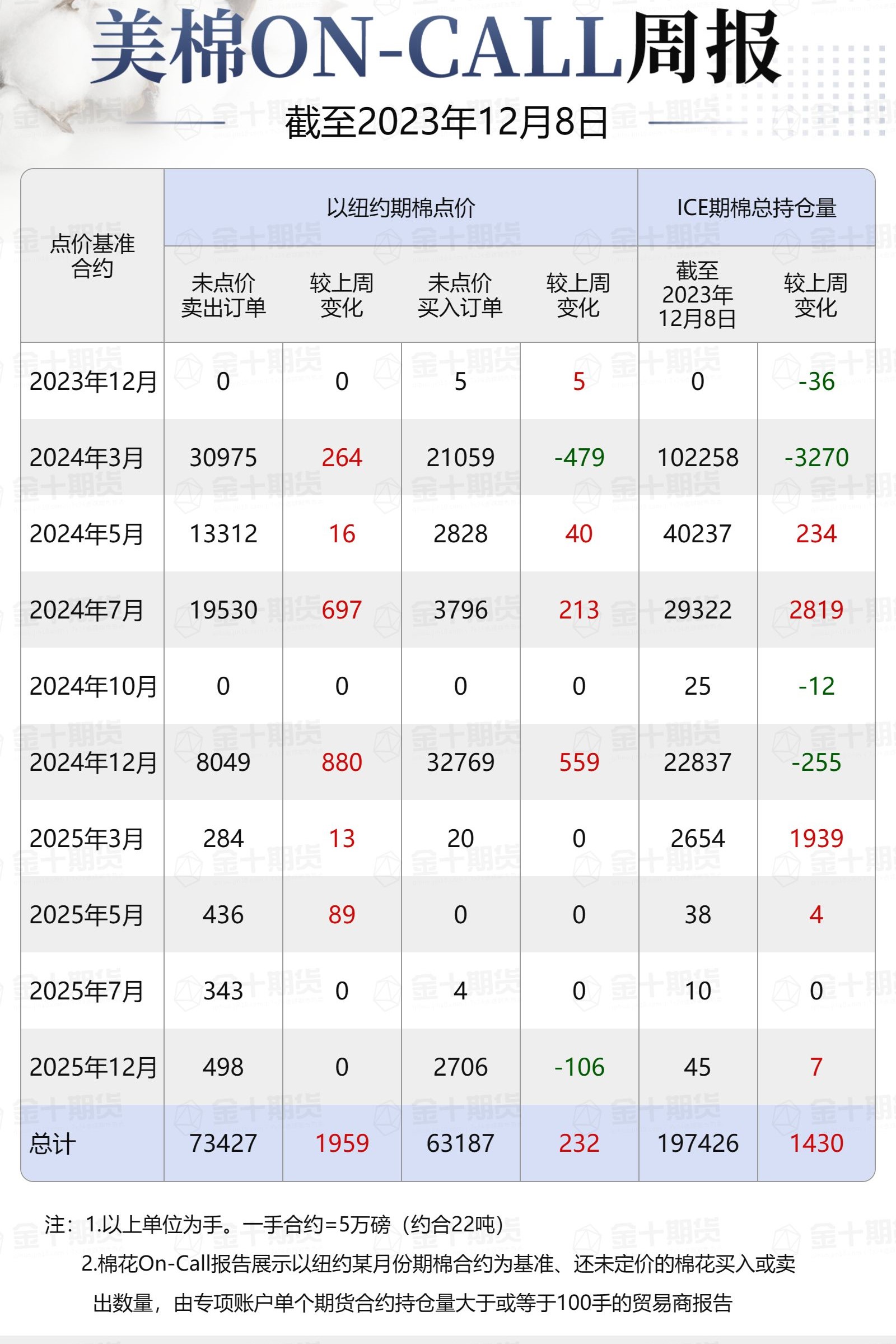 據(jù)美國商品期貨交易委員會(huì)(CFTC)最新數(shù)據(jù),截至12月8日,①美棉On-Call未點(diǎn)價(jià)賣出訂單73427手,環(huán)比增加1959手;未點(diǎn)價(jià)買入訂單63187手,環(huán)比增加232手;②ICE期棉2312合約上賣方未點(diǎn)價(jià)合約為0手,較此前一周增加0手;③ICE期棉2403合約上賣方未點(diǎn)價(jià)合約為30975手,較此前一周增加264手;④ICE期棉2405合約上賣方未點(diǎn)價(jià)合約為13312手,較此前一周增加16手;⑤ICE期棉2407合約上賣方未點(diǎn)價(jià)合約為19530手,較此前一周增加697手;⑥ICE棉花期貨盤面2023/24年度(8月至次年7月)的On-Call合約未點(diǎn)價(jià)賣出訂單為63817手,環(huán)比增加977手。