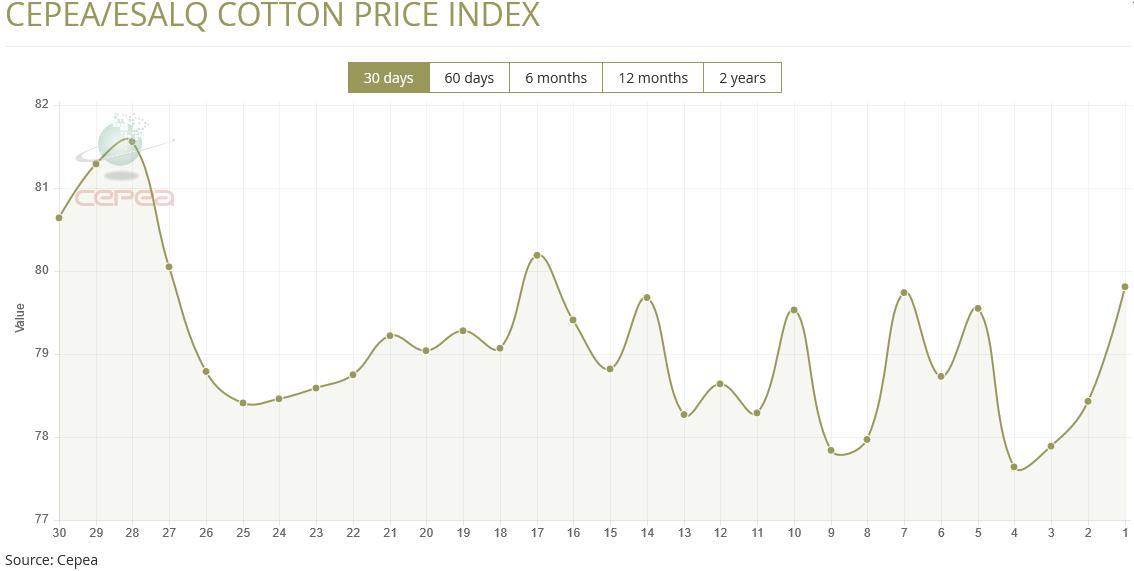 據(jù)外電12月14日消息,12月14日巴西CEPEA/ESALQ棉花價(jià)格指數(shù)報(bào)每磅79.81美分,較前一日上漲1.76%。