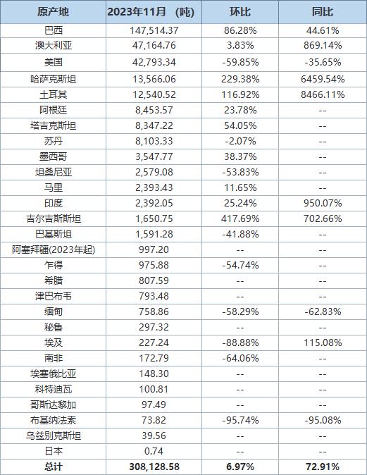 據(jù)海關(guān)統(tǒng)計數(shù)據(jù),2023年11月我國進(jìn)口棉花約31萬噸,環(huán)比增加約2萬噸,同比增長約72.9%。