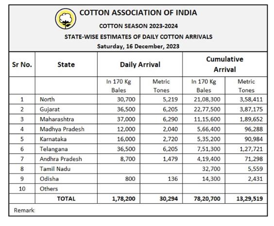 2023/24年度(10月至次年9月)迄今,印度棉花到貨量為7820700包或1329519噸。