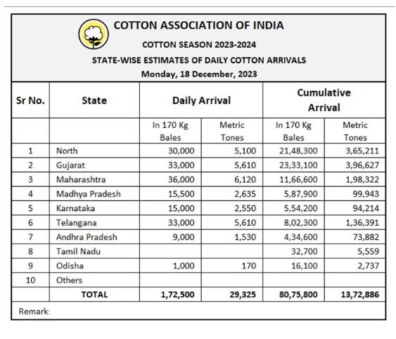 據(jù)外電12月18日消息,印度棉花協(xié)會(huì)(CAI)公布,12月18日印度棉花到貨量預(yù)計(jì)為172500包(每包170公斤)或29325噸。