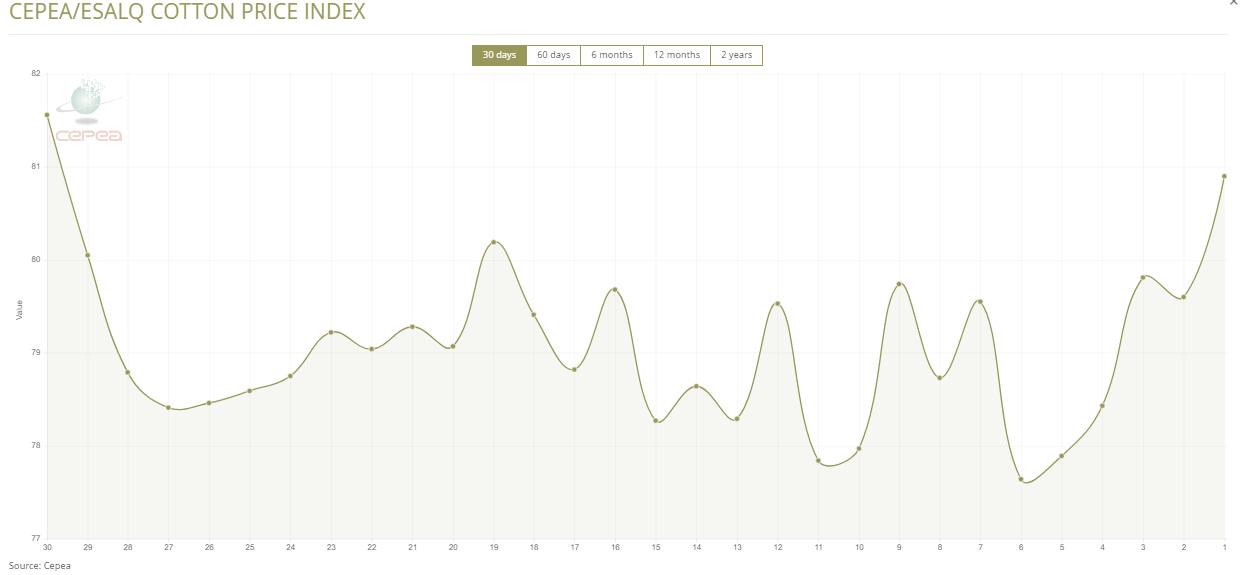 據(jù)外電12月18日消息,12月18日巴西CEPEA/ESALQ棉花價(jià)格指數(shù)報(bào)每磅80.90美分,較前一日上漲1.63%。
