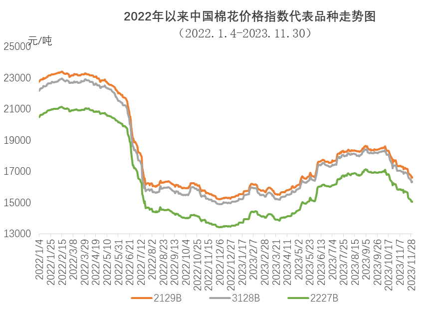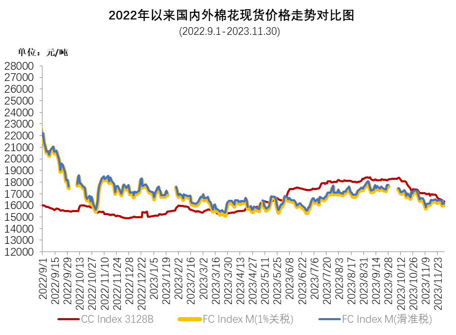 11月,新棉大量上市,棉市供應寬松。月內,紡織市場處傳統(tǒng)消費淡季,下游新增訂單不足,成品庫存持續(xù)增加,企業(yè)以降價去庫存為主,同時下調開機率,以緩解庫存及資金壓力,對皮棉原料謹慎采購。國內現(xiàn)貨價格持續(xù)下跌,最低跌至16314元/噸,棉企銷售壓力不斷增加。國際市場,受美聯(lián)儲加息預期增強及下游需求不佳等因素影響,國際棉價重心明顯下移。