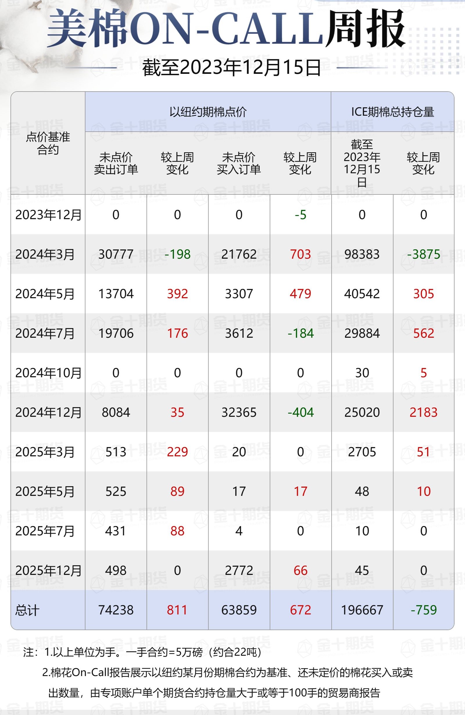 據(jù)美國商品期貨交易委員會(CFTC)最新數(shù)據(jù),截至12月15日,①美棉On-Call未點價賣出訂單74238手,環(huán)比增加811手;未點價買入訂單63859手,環(huán)比增加672手;②ICE期棉2312合約上賣方未點價合約為0手,較此前一周增加0手;③ICE期棉2403合約上賣方未點價合約為30777手,較此前一周減少198手;④ICE期棉2405合約上賣方未點價合約為13704手,較此前一周增加392手;⑤ICE期棉2407合約上賣方未點價合約為19706手,較此前一周增加176手;⑥ICE棉花期貨盤面2023/24年度(8月至次年7月)的On-Call合約未點價賣出訂單為64187手,環(huán)比增加370手。