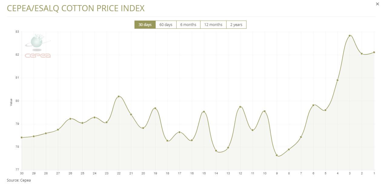 據(jù)外電12月21日消息,12月21日巴西CEPEA/ESALQ棉花價格指數(shù)報每磅82.11美分,較前一日上漲0.07%。