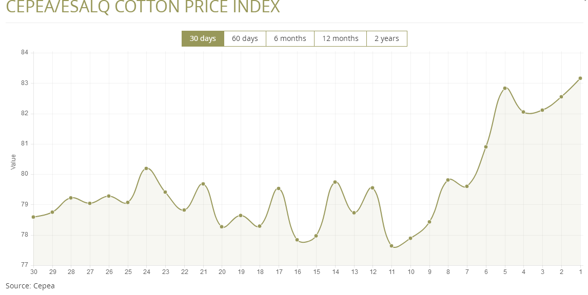 據(jù)外電12月26日消息,12月26日巴西CEPEA/ESALQ棉花價(jià)格指數(shù)報(bào)每磅83.16美分,較前一日上漲0.74%。