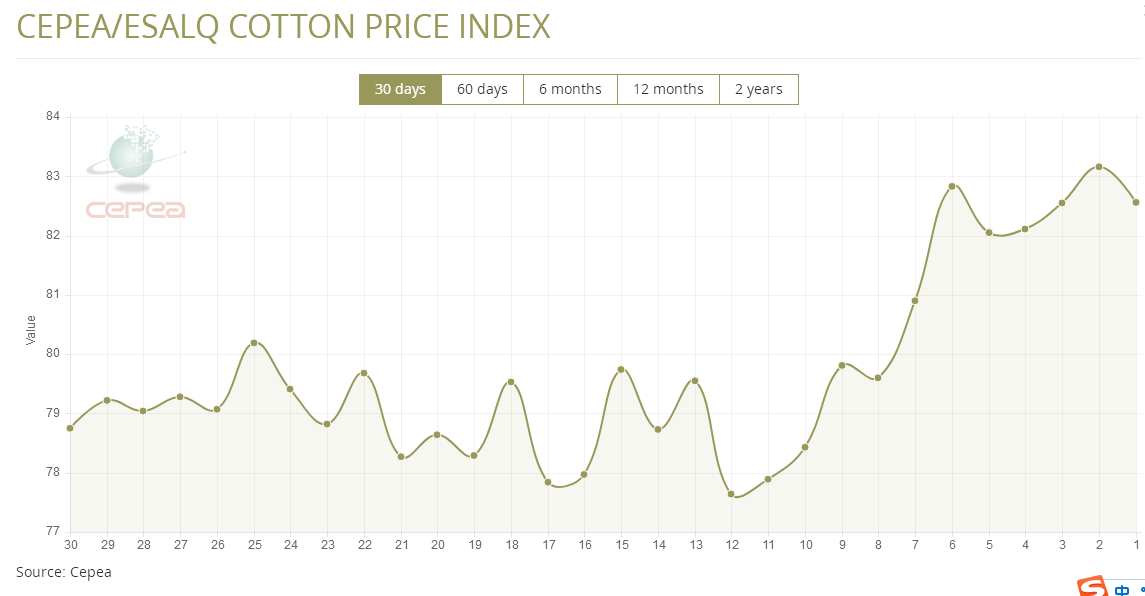 據(jù)外電12月27日消息,12月27日巴西CEPEA/ESALQ棉花價(jià)格指數(shù)報(bào)每磅82.56美分,較前一日下跌0.72%。