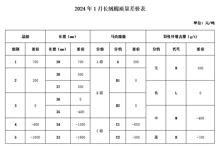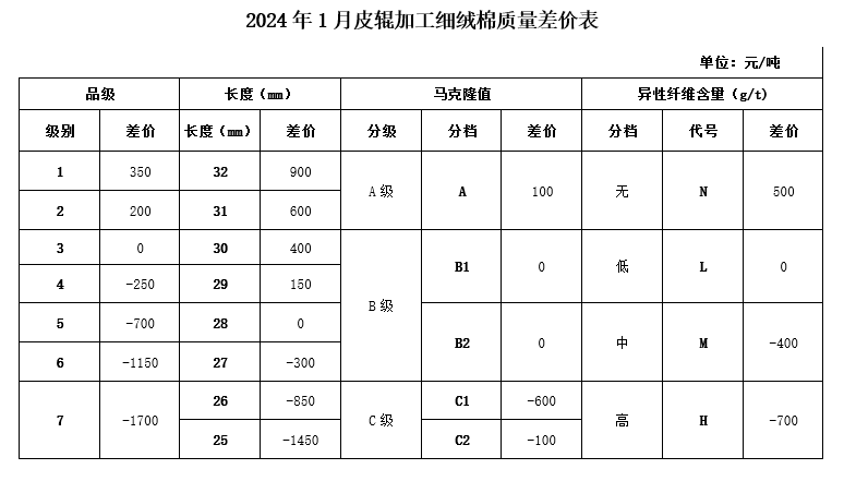 依據(jù)2023年12月的棉花公檢質(zhì)量數(shù)據(jù)、中國棉花協(xié)會棉花質(zhì)量價差自動生成系統(tǒng)采集的棉花加工企業(yè)銷售成交價、紡織企業(yè)監(jiān)測點的采集數(shù)據(jù)以及當(dāng)月的中國棉花價格指數(shù),并征求業(yè)內(nèi)相關(guān)專家的意見,與上月相比,2024年1月《中國棉花協(xié)會國產(chǎn)棉質(zhì)量差價表》做如下調(diào)整: