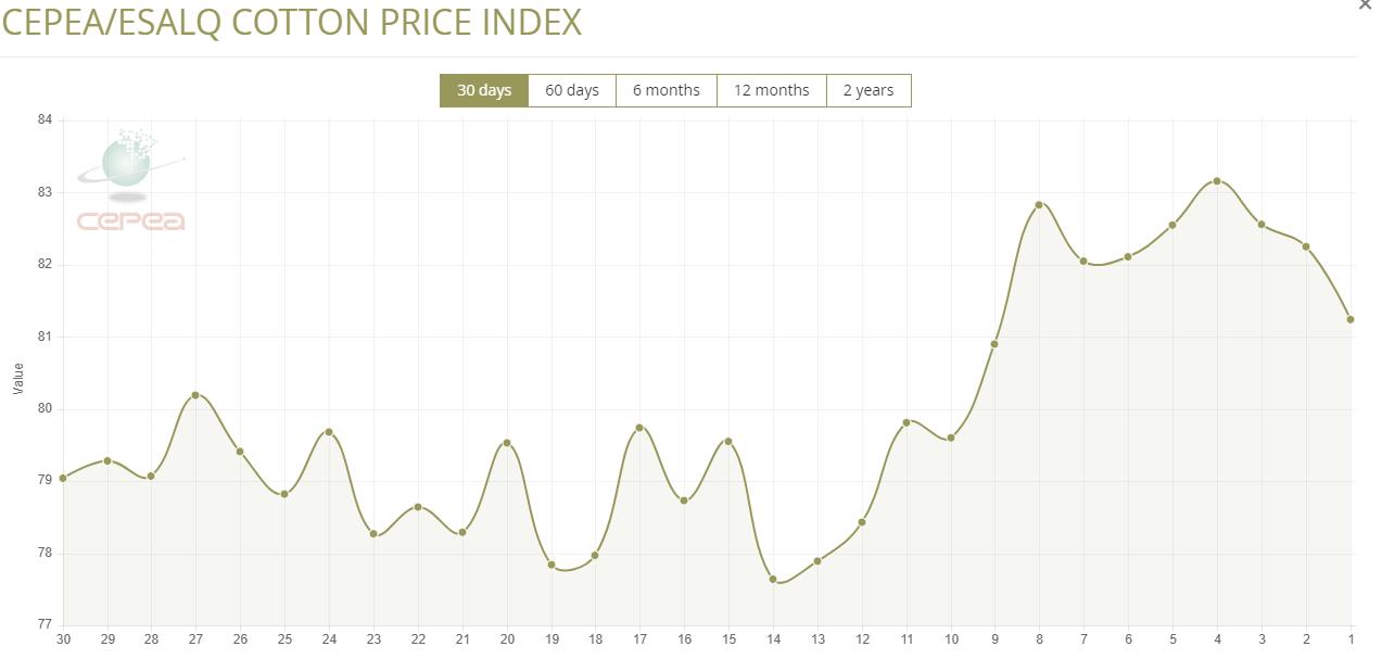 據(jù)外電1月2日消息,1月2日巴西CEPEA/ESALQ棉花價格指數(shù)報每磅81.24美分,較前一日下跌1.23%。