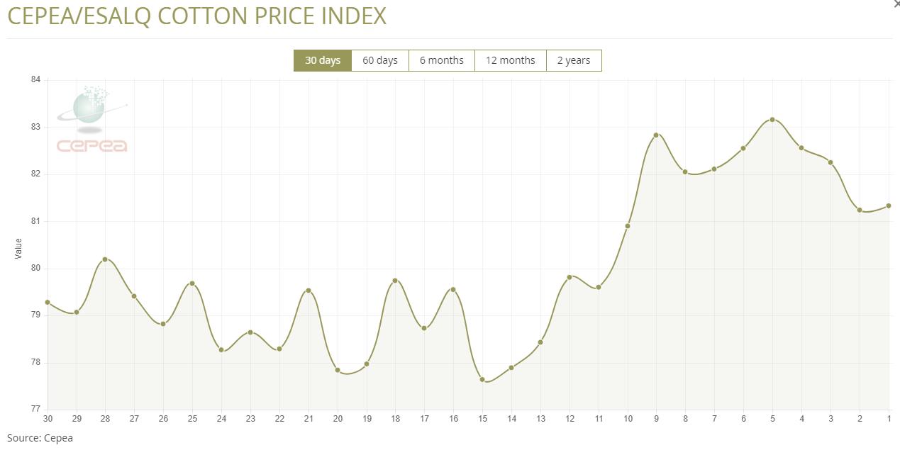 據(jù)外電1月3日消息,1月3日巴西CEPEA/ESALQ棉花價格指數(shù)報每磅81.33美分,較前一日上漲0.11%。