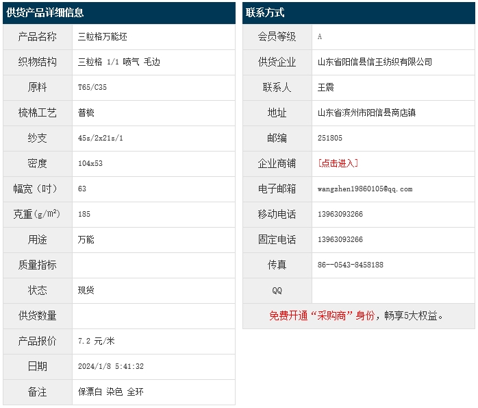 1月7日,山東陽(yáng)信縣信王紡織有限公司滌棉三粒格T65/C35 45/2x21 104x53 63" 1/1 185g/㎡ 噴氣 毛邊,報(bào)價(jià)為7.2元/米,實(shí)際成交價(jià)以協(xié)商為準(zhǔn)。[點(diǎn)擊查看詳情]