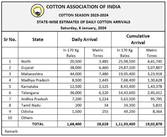 據(jù)外電1月6日消息,印度棉花協(xié)會(huì)(CAI)公布,1月6日印度棉花到貨量預(yù)計(jì)為168400包(每包170公斤)或28628噸。
