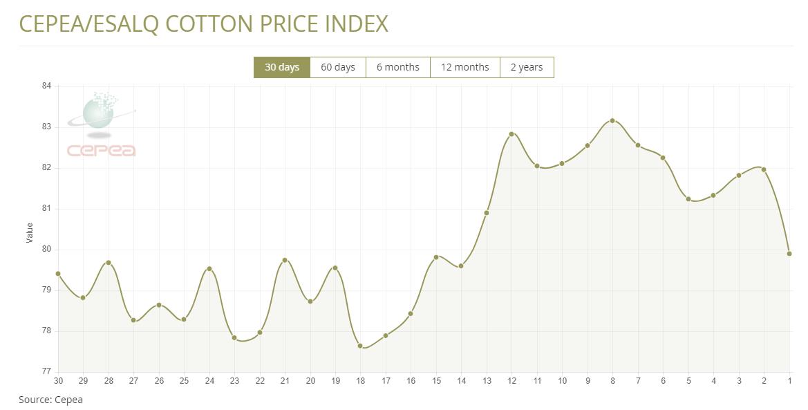據外電1月8日消息,1月8日巴西CEPEA/ESALQ棉花價格指數報每磅79.90美分,較前一日下跌2.51%。