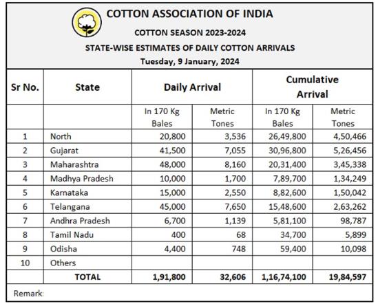 2023/24年度(10月至次年9月)迄今,印度棉花到貨量為11674100包或1984597噸。