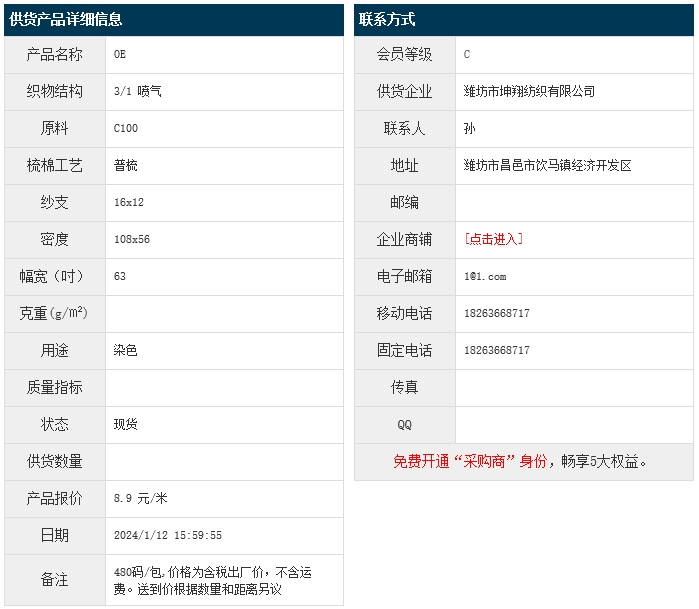 1月12日,濰坊坤翔紡織有限公司純棉布OEC100 16x12 108x56 63" 3/1 噴氣,報價為8.9元/米,實際成交價以協(xié)商為準。[點擊查看詳情]