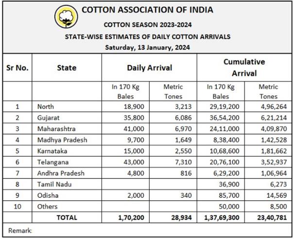 據(jù)外電1月13日消息,印度棉花協(xié)會(CAI)公布,1月13日印度棉花到貨量估計為170200包(每包170公斤)或28934噸。