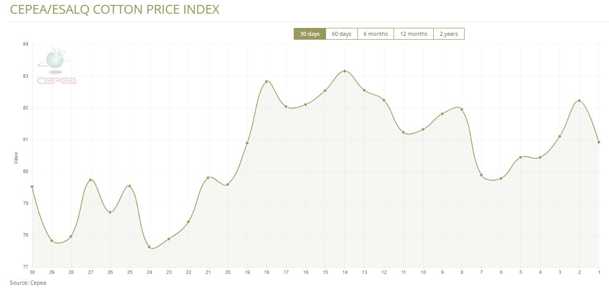 據(jù)外電1月16日消息,1月16日巴西CEPEA/ESALQ棉花價格指數(shù)報每磅80.93美分,較前一日下跌1.58%。