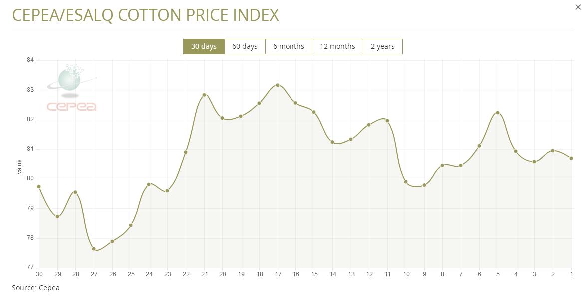 據(jù)外電1月19日消息,1月19日巴西CEPEA/ESALQ棉花價格指數(shù)報每磅80.69美分,較前一日下跌0.32%。