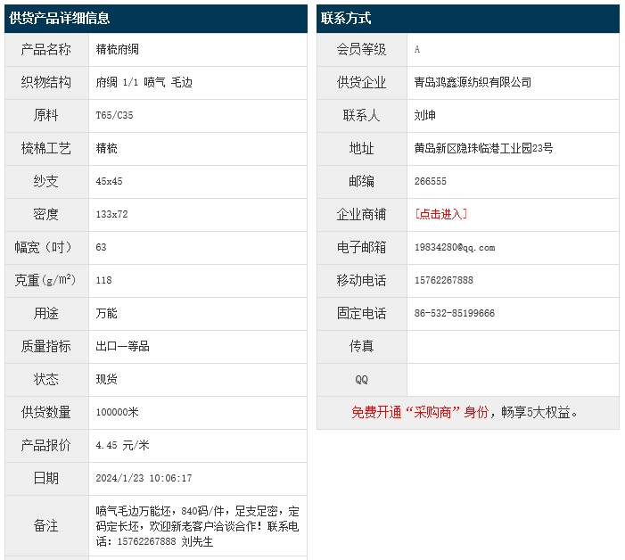 1月23日,青島鴻鑫源紡織有限公司滌棉府綢T65/JC35 45x45 133x72 63" 1/1 118g/㎡ 噴氣 毛邊,報價為4.45元/米,實際成交價以協(xié)商為準。[點擊查看詳情]