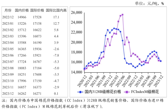(一)國(guó)內(nèi)棉價(jià)繼續(xù)下跌。本月,紡織廠新增訂單數(shù)量有限,開(kāi)機(jī)率下降,棉花采購(gòu)意愿不強(qiáng),價(jià)格繼續(xù)下跌。據(jù)《中國(guó)棉花工業(yè)庫(kù)存調(diào)查報(bào)告》,截至12月初,被調(diào)查企業(yè)開(kāi)機(jī)率為81.1%,環(huán)比下降2.3個(gè)百分點(diǎn);準(zhǔn)備采購(gòu)棉花的企業(yè)占40.6%,環(huán)比減6.5個(gè)百分點(diǎn),同比減17.2個(gè)百分點(diǎn),比近5年同期平均水平減少18.7個(gè)百分點(diǎn)。據(jù)國(guó)家棉花市場(chǎng)監(jiān)測(cè)系統(tǒng)數(shù)據(jù),截至12月21日,全國(guó)皮棉銷(xiāo)售率為13.2%,同比下降2.2個(gè)百分點(diǎn),較過(guò)去4年均值下降10.6個(gè)百分點(diǎn)。12月國(guó)內(nèi)3128B級(jí)棉花月均價(jià)每噸16262元,環(huán)比跌3.5%,同比漲8.7%。鄭棉期貨主力合約(CF405)月結(jié)算價(jià)每噸15450元,環(huán)比漲3.3%,同比漲12.1%。
