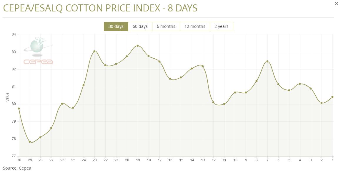 據(jù)外電1月23日消息,1月23日巴西CEPEA/ESALQ棉花價(jià)格指數(shù)報(bào)每磅80.42美分,較前一日上漲0.44%。