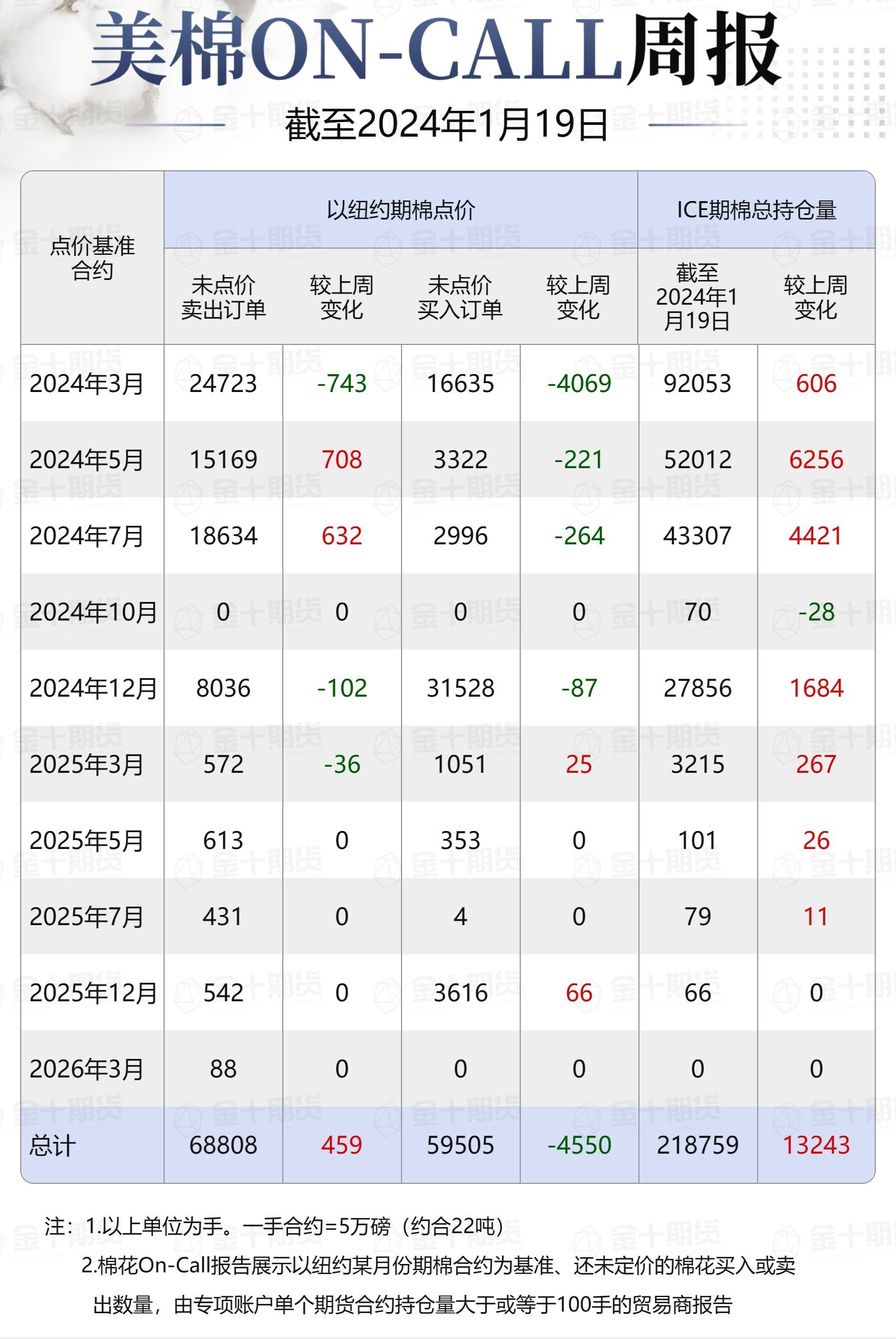 據(jù)美國(guó)商品期貨交易委員會(huì)(CFTC)最新數(shù)據(jù),截至1月19日,①美棉On-Call未點(diǎn)價(jià)賣出訂單68808手,環(huán)比增加459手;未點(diǎn)價(jià)買入訂單59505手,環(huán)比減少4550手;②ICE期棉2403合約上賣方未點(diǎn)價(jià)合約為24723手,較此前一周減少743手;③ICE期棉2405合約上賣方未點(diǎn)價(jià)合約為15169手,較此前一周增加708手;④ICE期棉2407合約上賣方未點(diǎn)價(jià)合約為18634手,較此前一周增加632手;⑤ICE棉花期貨盤面2023/24年度(8月至次年7月)的On-Call合約未點(diǎn)價(jià)賣出訂單為58526手,環(huán)比增加597手。