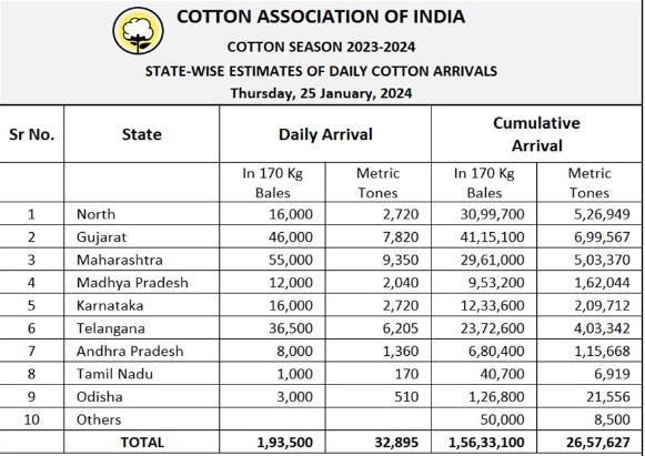 2023/24年度(10月至次年9月)迄今,印度棉花到貨量為15633100包或2657627噸。